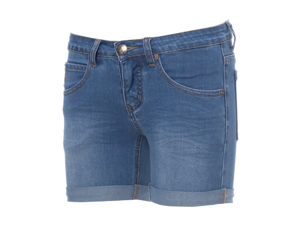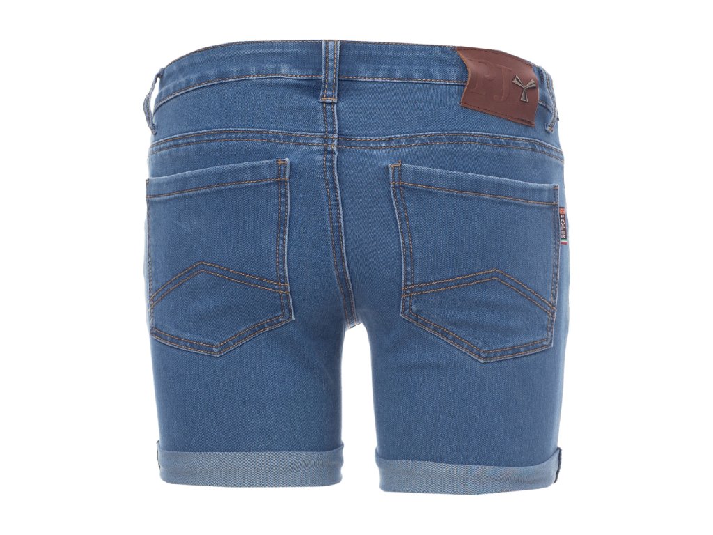 Dámské bermudy džínového střihu, s pěti kapsami se zapínáním na kovový zip a knoflík, poutka v pase, záložka na nápletech nohavic, stone washed, opotřebený a vybledlý efekt, kontrastní odolné prošití, dvojité prošití na vnitřní straně nohavic, rovný střih, cvočky, záplaty z pravé kůže. Hmotnost látky: 12oz.