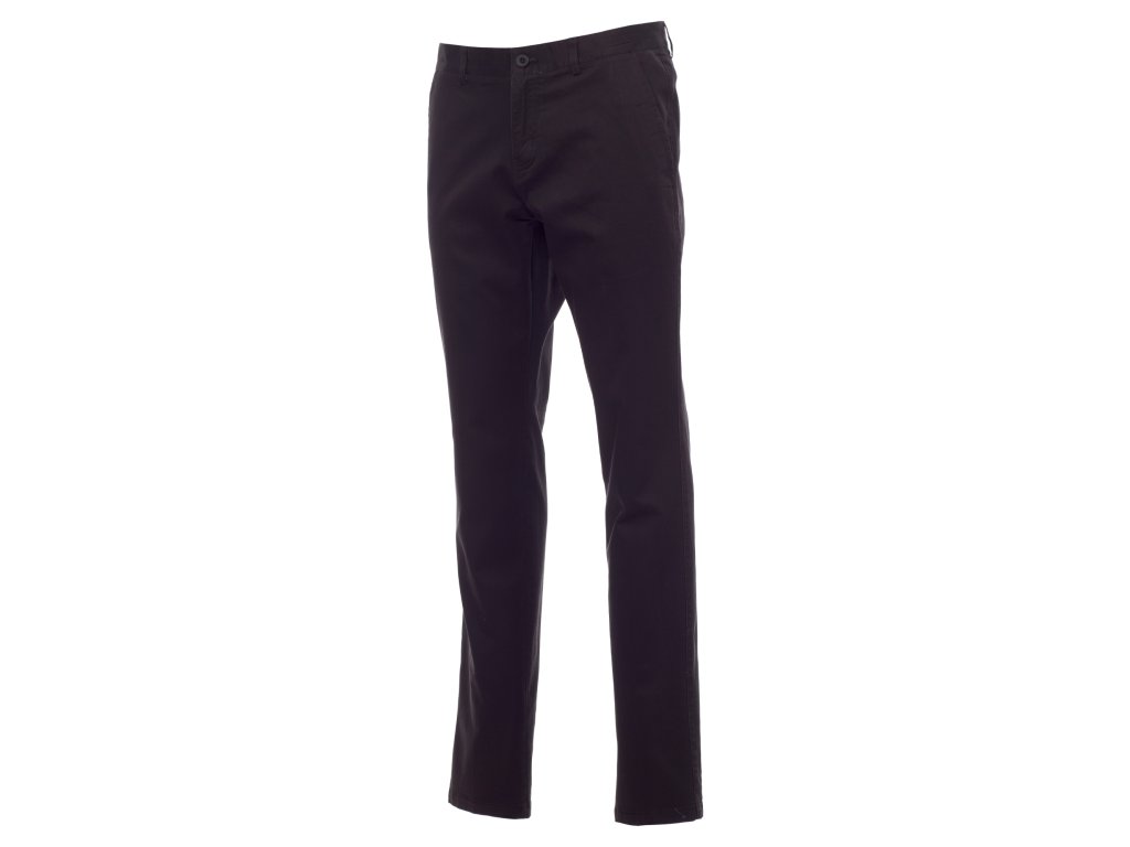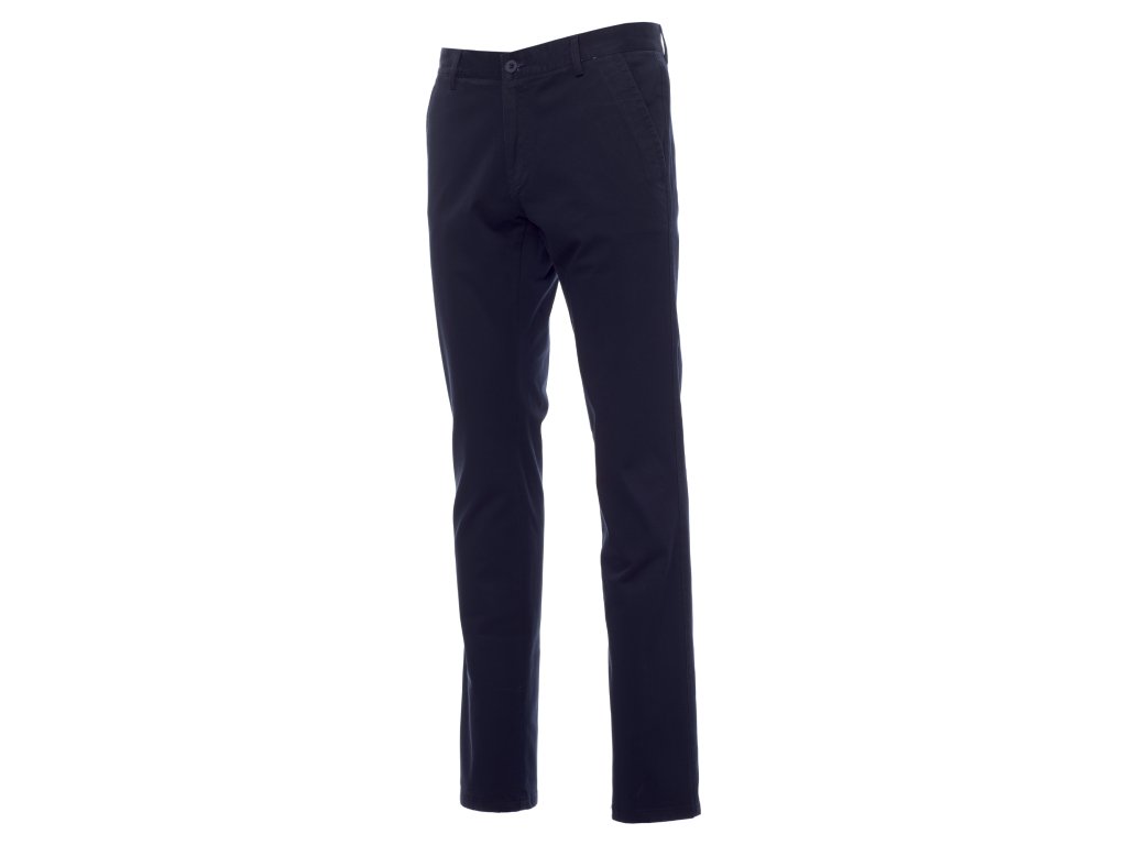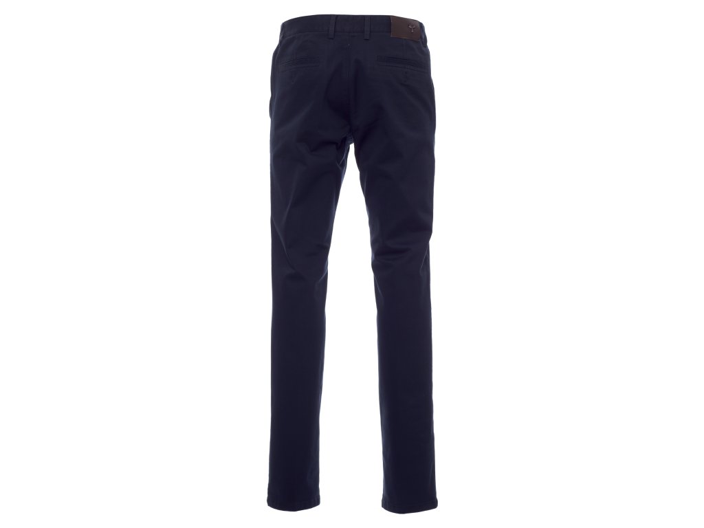 Pánské celoroční klasické kalhoty s francouzskými kapsami, malá kapsa na zip, dvě zadní štěrbinové kapsy s knoflíkem, zapínání na zip a knoflík, poutka na pásek, štítek z pravé kůže, česaná dvojmo tkaná bavlna, enzymové praní.