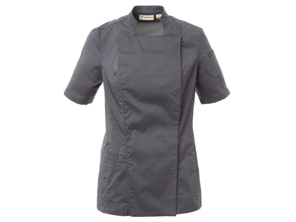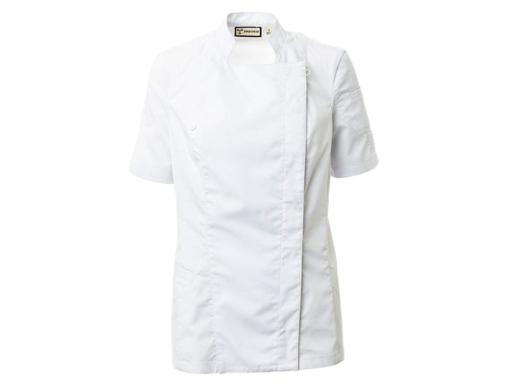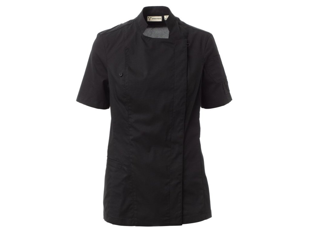 Dámský kuchařský rondon se stojáčkem, z bavlněného ripstopu a Lycry ® T400 ®, s vynikajícími elastickými a prodyšnými vlastnostmi, s pohodlnou síťovinou na zádech pro zvýšení prodyšnosti. Dvouřadé zapínání na patentky, klopa, kterou lze přeložit a připevnit ke hrudi pomocí zapínání na nezakrytý knoflík, a vytvořit tak efekt klopy na míru a inovativní výstřih do V. Krátké rukávy s lemem. Ikonická tvarovaná nášivka na levém rameni, s výšivkou vrtule tón v tónu, doplněná kapsičkou na pero. Praktická kapsa na smartphone v pase.