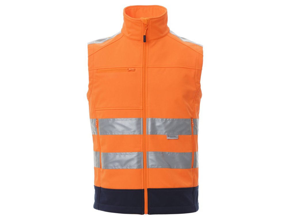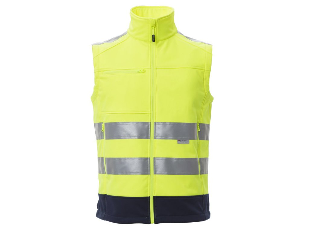 WP 8000 mm H₂O, WVT 5000 g/m² 24h. Pánská ergonomická dvoubarevná vesta s vysokou viditelností s reflexními pruhy 3M, utěsněný celozip SBS, dvě postranní kapsy na zip, jedna kapsa na hrudi, odnímatelné a zavírací pružné pouzdro na jmenovku.