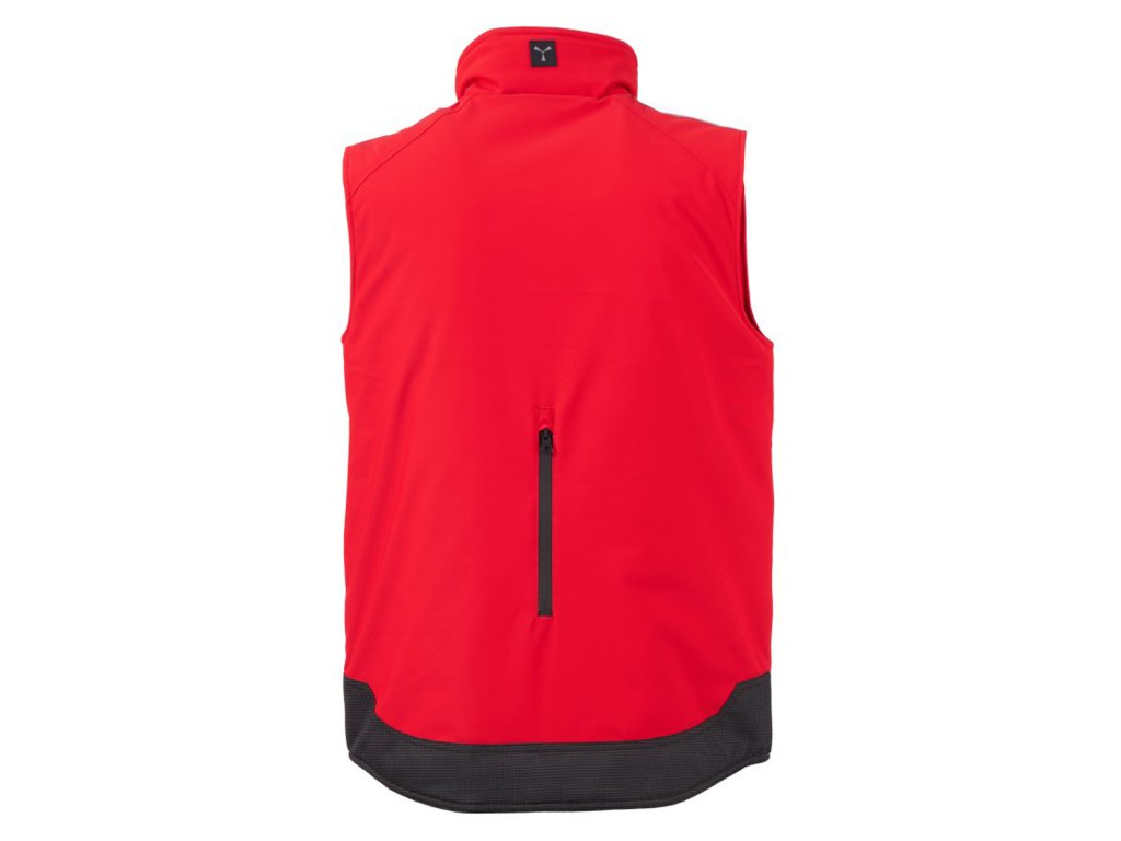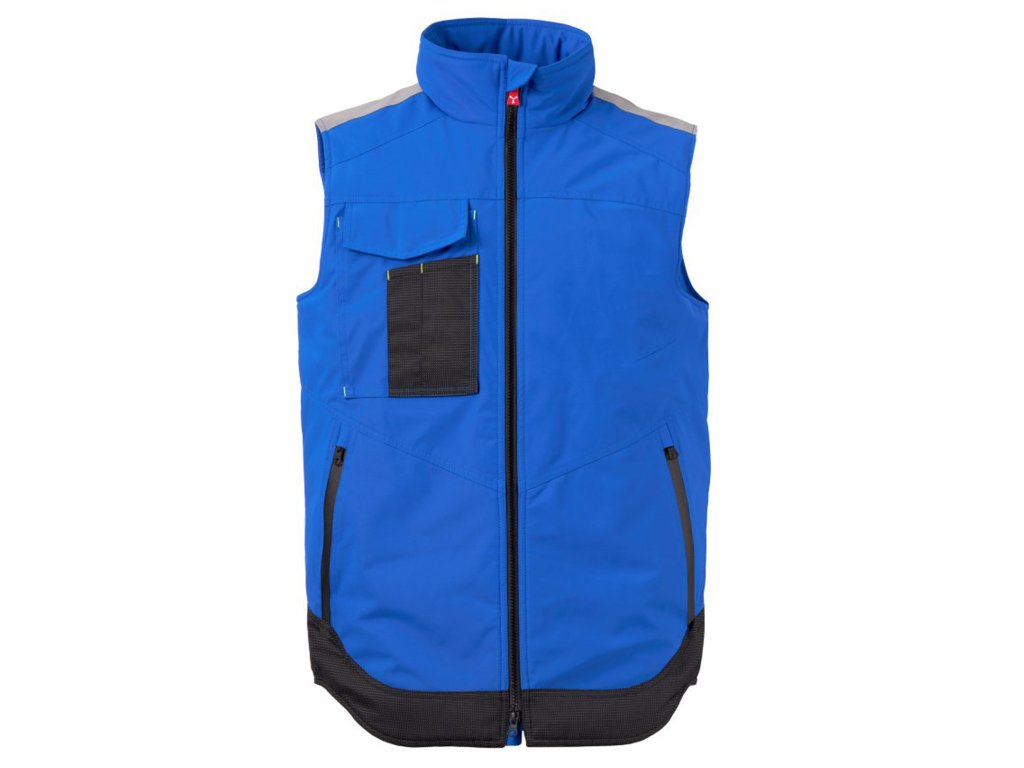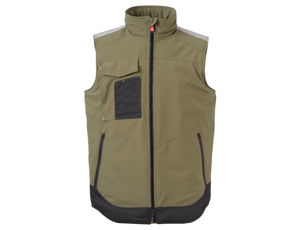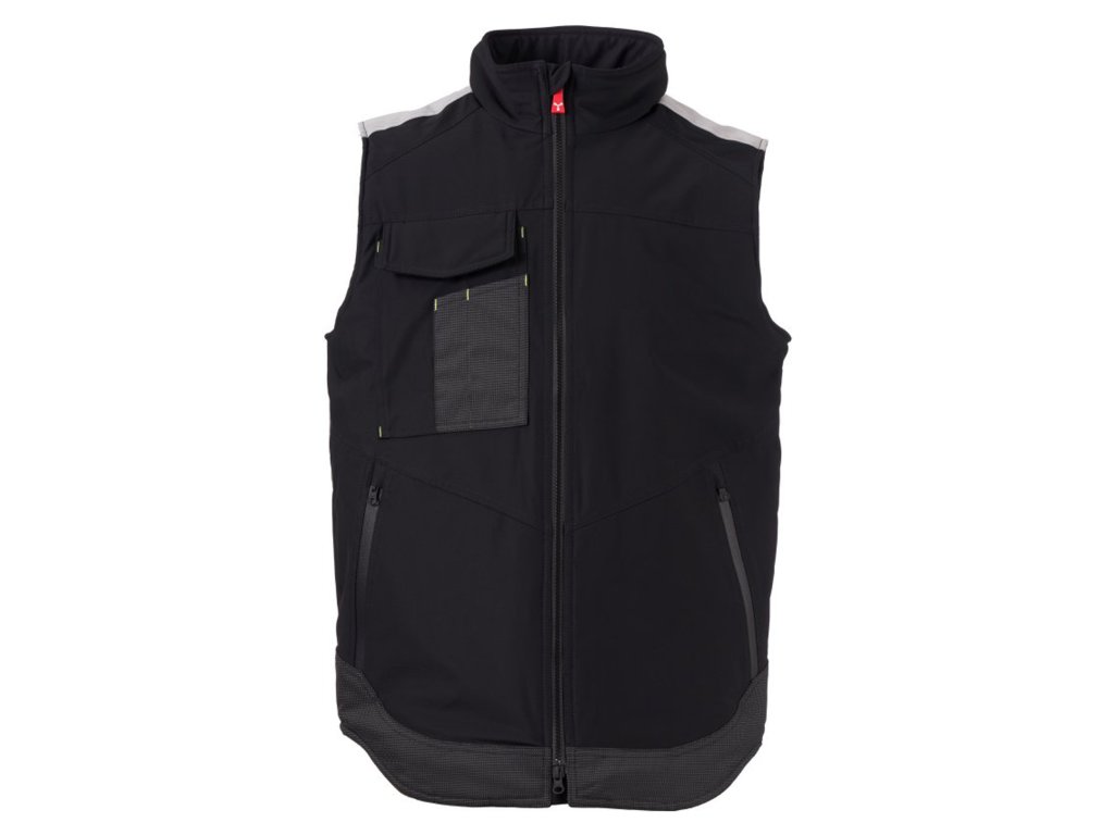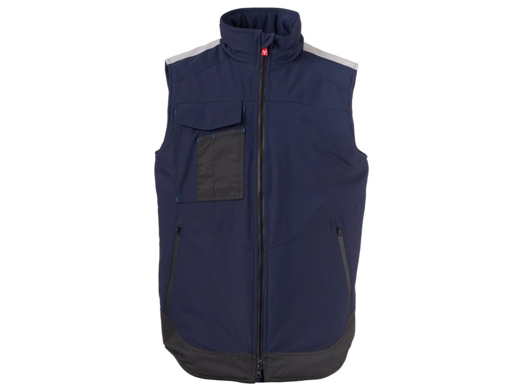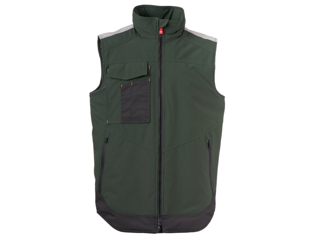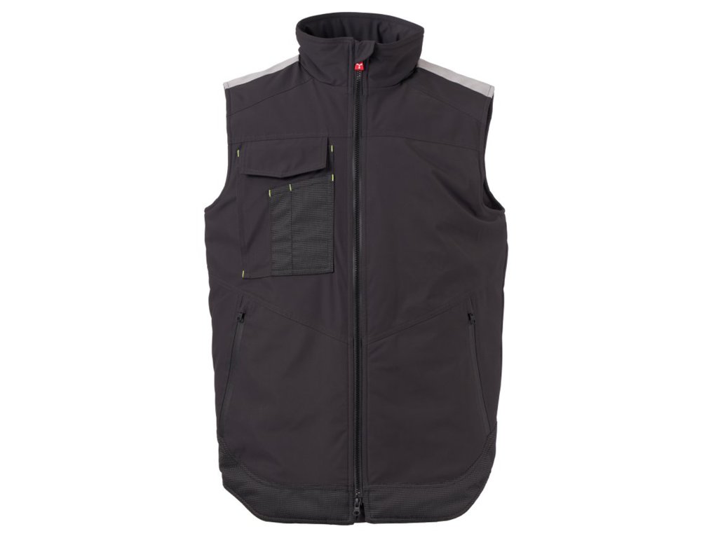 WP 8000 mm H₂O, WVT 5000 g/m² 24h. Pánská softshellová vesta 3 vrstvy, střední výplň (140g/m²), zapínání na zip SBS s kovovým jezdcem „semi-auto lock“ a přizpůsobeným taháčkem. Reflexní páska na ramenou. Kapsa na hrudi Lock System s klopou, kroužkem na jmenovku a očkem na pero. Dvě boční kapsy s voděodolným zipem. Prvek „life-saving“ na zadní straně, s vnitřním reflexním logem a voděodolným zipem. Dvě vnitřní kapsy, z nichž jedna tvarovaná na zip na pravé straně hrudi a druhá na tablet se zapínáním na suchý zip na levé straně. Spodní část stažitelná pomocí přizpůsobených zarážek. Tečkovaná tkanina s reflexním efektem.